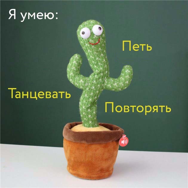 Кактус Повторюшка. Умеет петь и танцевать. Повторяет звуки 120 мелодийТанцующий кактус – это чудо игрушка, которая понравится и детям и взрослым! Поет 120 песен, танцует со светомузыкой и повторяет все звуки вокруг, что очень привлекает детей) Веселая музыка и танцы подходят для создания приятной атмосферы и подходят для вечеринок. Записывающее устройство в кактусе запишет любое ваше предложение, которое Вы скажете рядом с танцующим кактусом, и через 1-2 секунды оно повторит ваши слова очень смешным голосом и утонченным танцем! Функция записи языка 10 секунд. Эта забавная милая игрушка имеет высоту 34 сантиметров. Танцующий кактус будет интересен и совсем маленьким детям, и взрослым. Подарите своим детям этого замечательного кактуса, который станет им верным другом Достоинства: -¦Функция обратной связи позволяет кактусу повторять все, что вы говорите. - игрушка хороша для дошкольного воспитания. Она танцует в ритме, привлекая внимание малышей и привлекая их. - работает от USB - лучший подарок на день рождения для детей. Веселая музыка и пляски очень подходят для создания приятной атмосферы и подходят для вечеринок. ![]() ![]() ![]() ![]() ![]() ![]() ![]() Характеристика: Вид: Игрушка для детей Дополнительные характеристики: 120 песень 10 секунд записи Особенности: Световые эффекты, Мелодии, Звуковые эффекты Возраст: С 3-х месяцев Тип питания: USB Размер: 34х20х10см