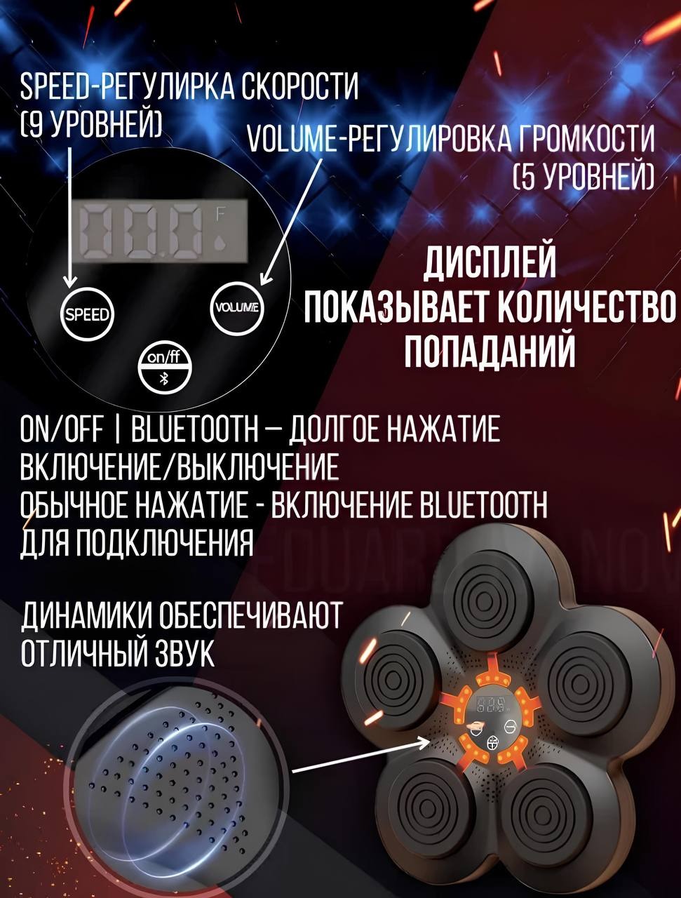 Тренажер не только помогает развивать физическую форму, но и способствует снятию напряжения и концентрации внимания. Подключение к музыке через Bluetooth делает тренировки интереснее: световая индикация реагирует на ритм и удары, создавая эффект присутствия на ринге.