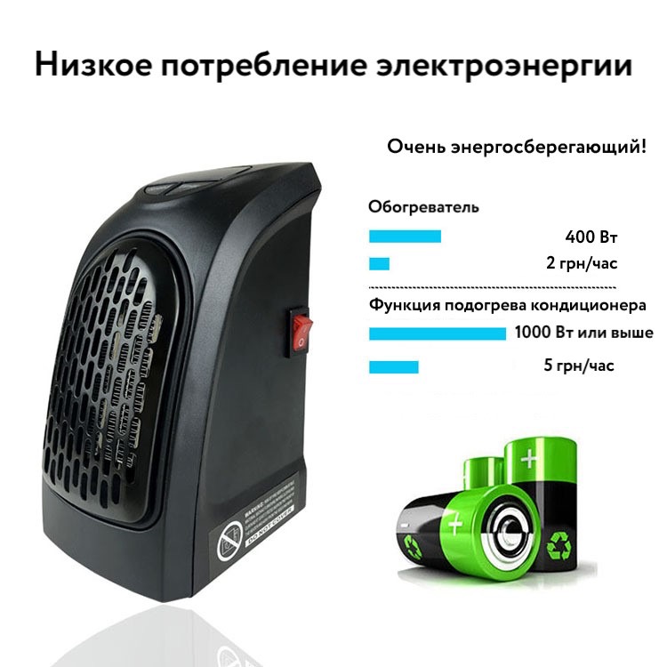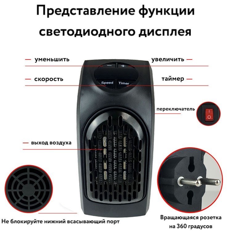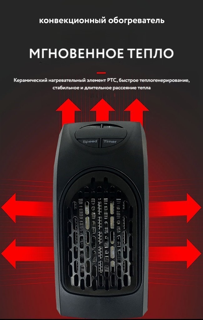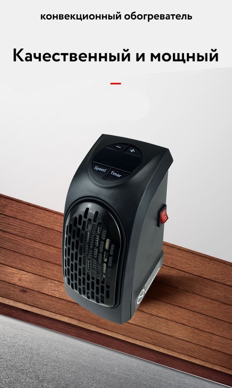 Портативный обогреватель – это компактное устройство, которое подключается прямо к розетке. Эффективный термо-керамический прибор в компактном корпусе, который поможет согреть помещение с площадью до 25 м3. Работает без проводов и не занимает места на полу. Подключите его к любой розетке и нажмите кнопку. Сразу начнется обогрев. Регулятор термостата дает Вам точный контроль температуры, а 2-х скоростной вентилятор отвечает за циркуляцию воздуха, чтобы комната оставалась теплой и уютной.
