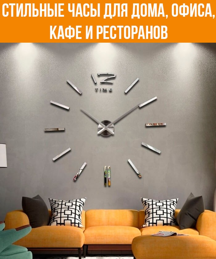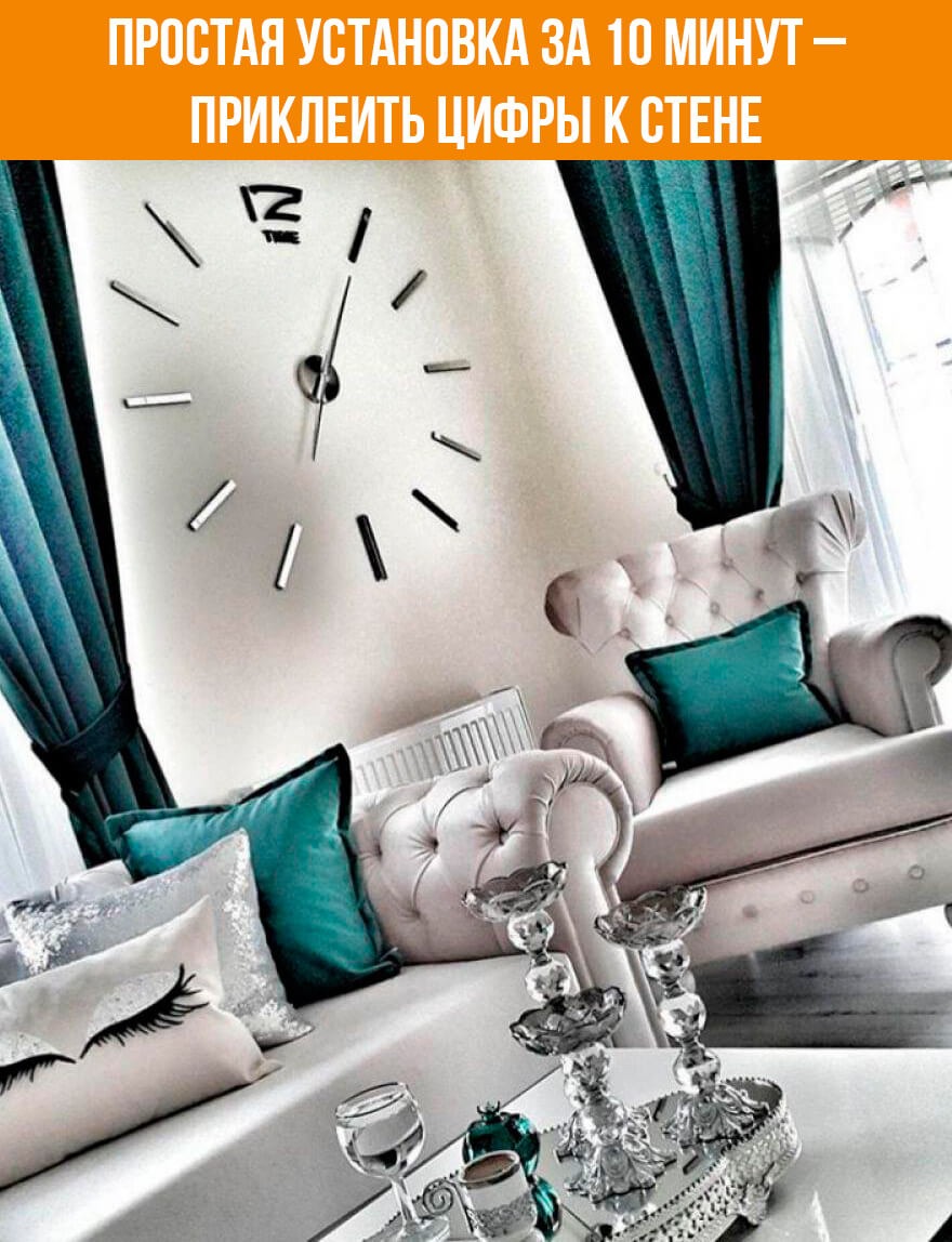 Сделайте любую плоскую поверхность функциональной. Для этого просто рассчитайте расстояние и приклейте наклейки с помощью пены к поверхности, на которой вы хотите разместить часы.Подойдет поверхность любого размера в доме, офисе или кафе / ресторане. Часовой механизм работает бесшумно, поэтому наслаждайтесь тишиной. Диаметр часов может варьироваться от 60 до 120 см., благодаря чему вы сами сможете подобрать оптимальный для своего интерьера размер настенных часов, что дает возможность ощутить себя дизайнером своего дома или офиса, творцом эксклюзивного интерьера.