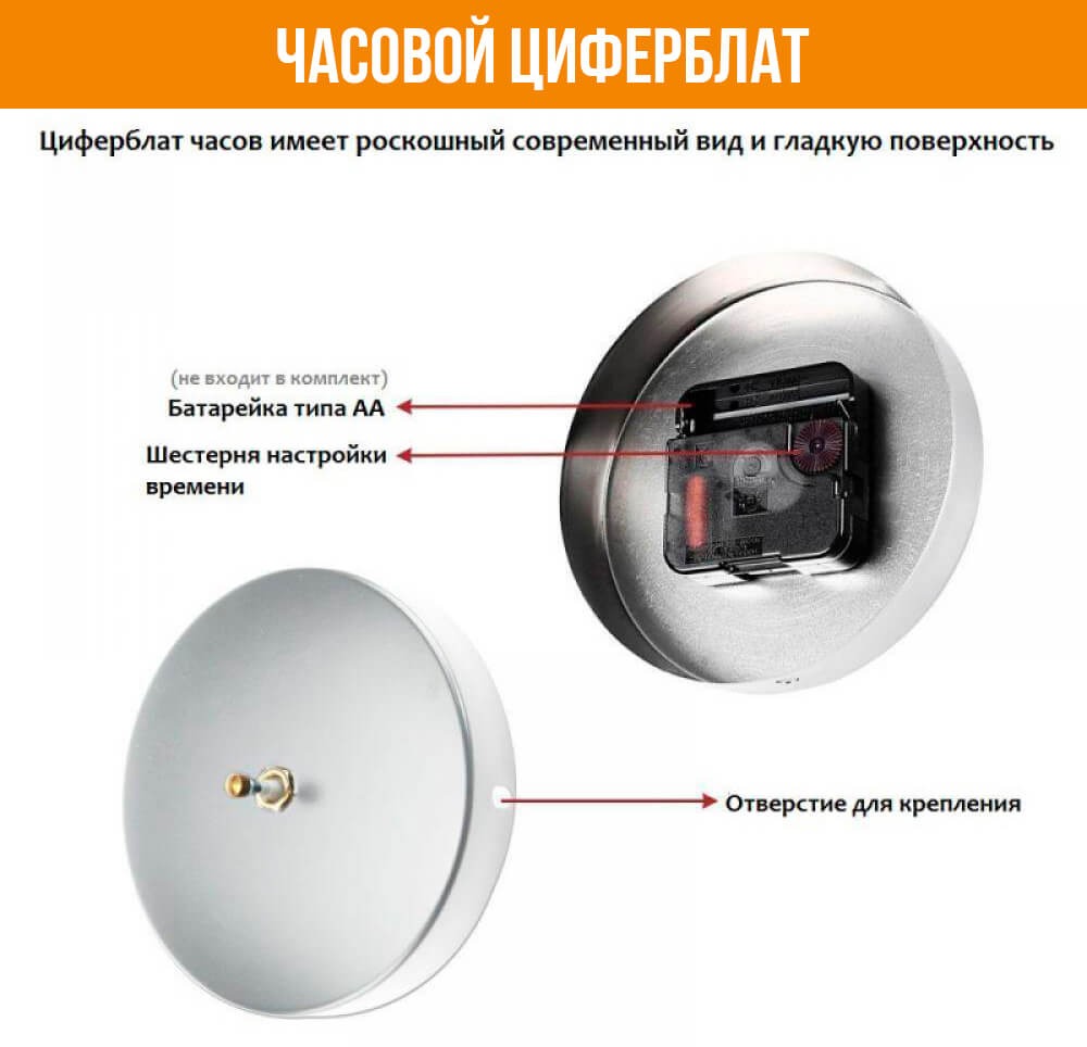 - Диаметр механизма на который крепятся стрелки: 10 см, высота 2 см;