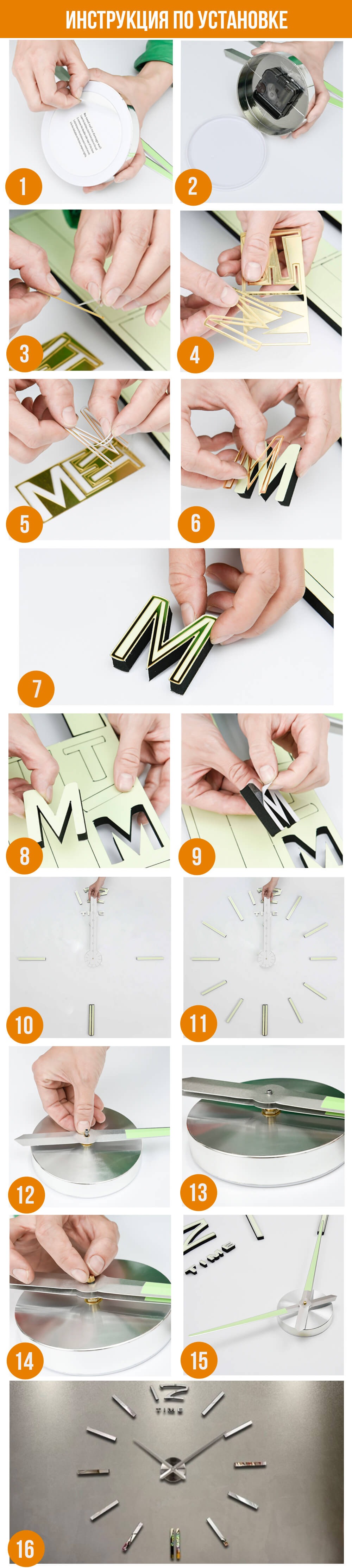 Цифры имеют самоклеящуюся поверхность для крепления на стене. Корпус часов крепится путем навешивания на крепежный элемент (присутствует в наборе).