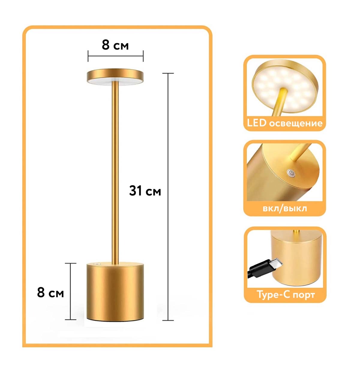 - Эргономичный дизайн: круглые формы, освещение на 360 градусов, корпус из алюминиевого сплава, стойкий к царапинам и прочный, экологически чистый и низкое энергопотребление, противоскользящий дизайн основы, гладкая и тонкая металлическая ручка для придания стильному виду.