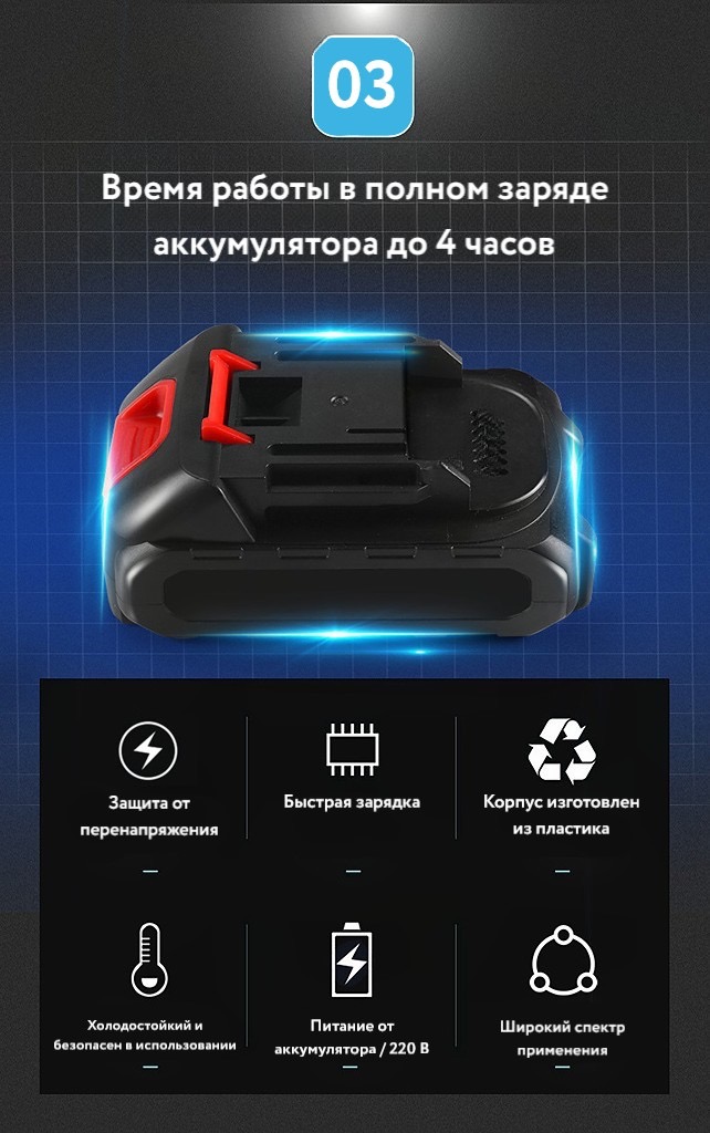 Благодаря этому Вы можете использовать секатор даже в местах, где нет электричества. Время работы в полном заряде аккумулятора до 4 часов. Время зарядки до 1,5 часов.