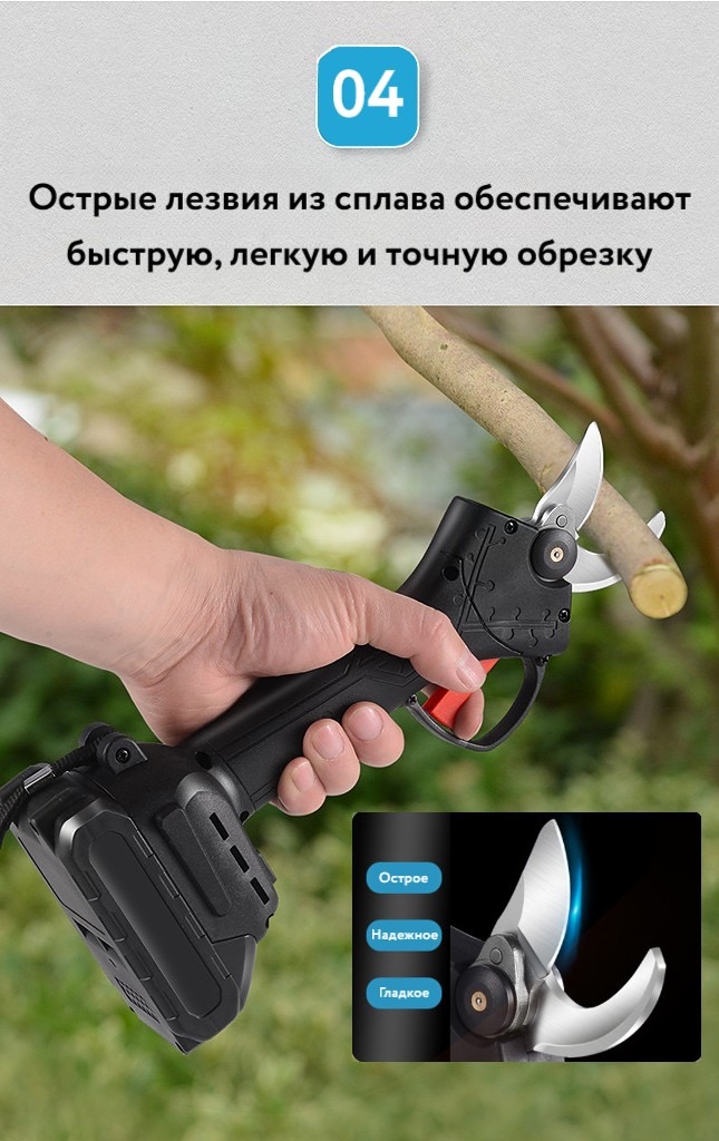 Электрический аккумуляторный секатор на 24V - это инструмент, предназначенный для обрезки веток и растений. Он работает на аккумуляторе, что обеспечивает мобильность и удобство использования. Секатор имеет легкий корпус, эргономичную ручку и высокую производительность, что позволяет быстро выполнять работы в саду или огороде.
