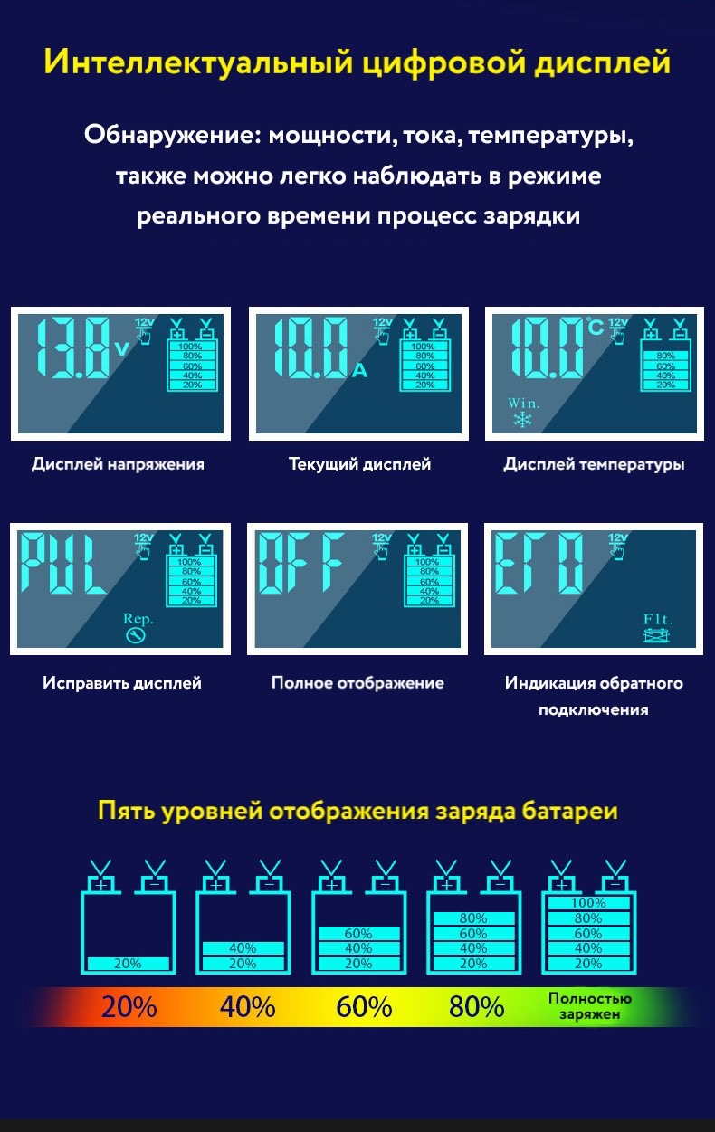| Совместимость | Свинцово-кислотные и AGM аккумуляторы емкостью 10-100 Ач |