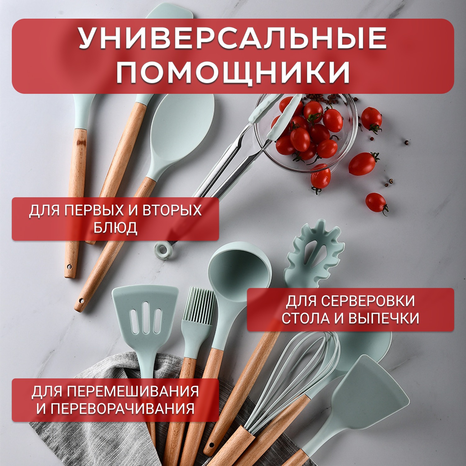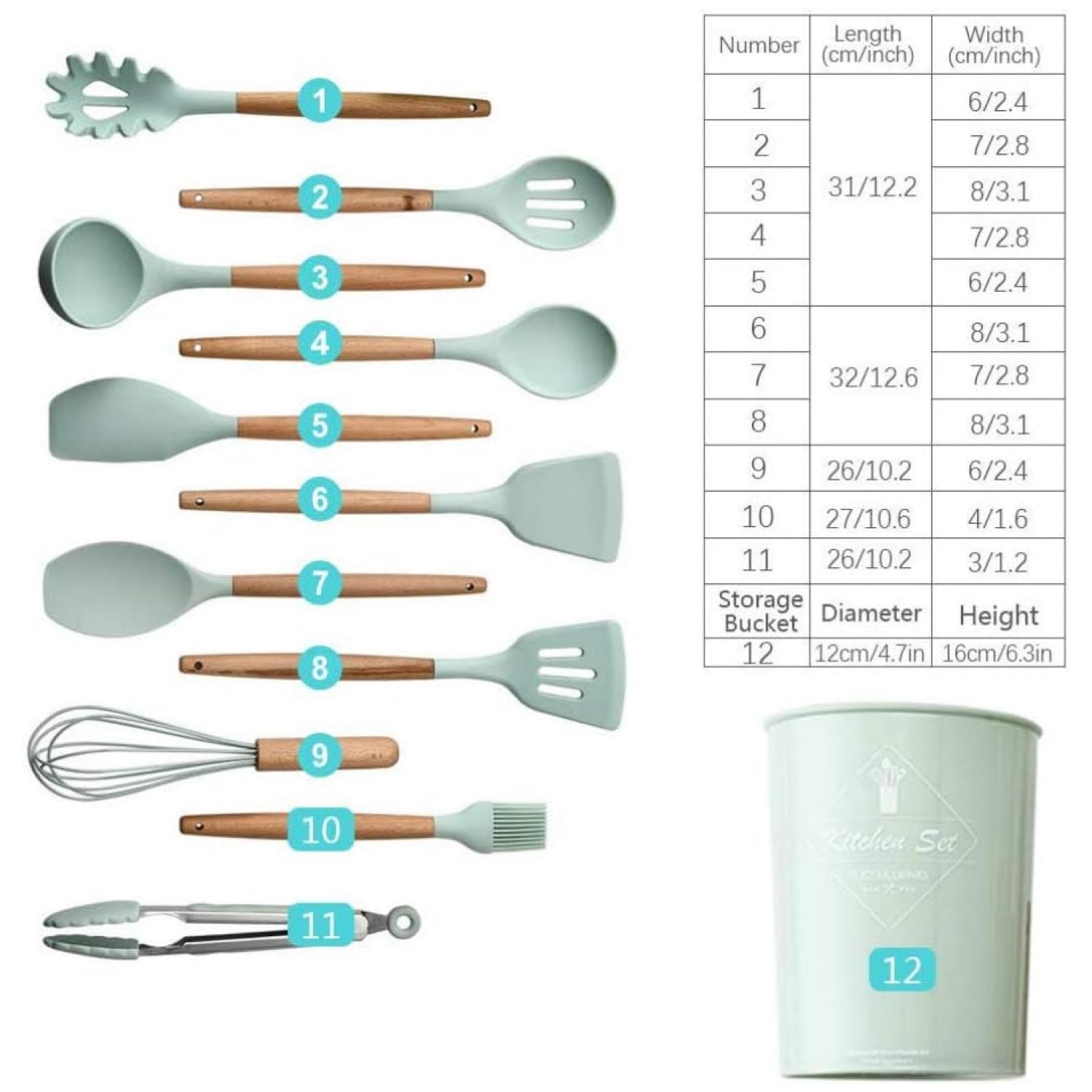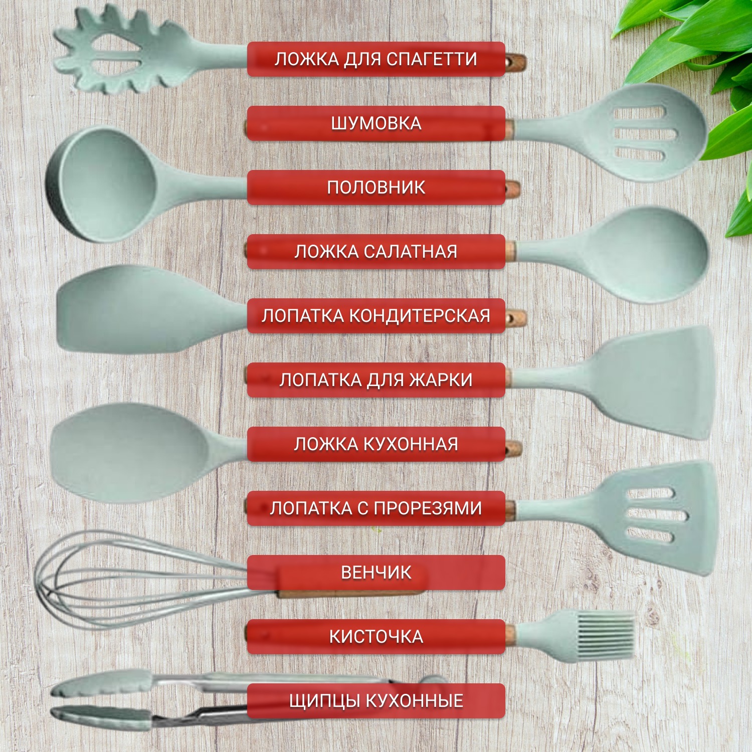 | В комплекте | Лопатка для жарки, шпатель, венчик, щипцы, плоская ложка для выпечки, лопатка с отверстиями для слива масла, половник, ложка для салата, кисточка для масла, ложка для спагетти, шумовка, подставка |