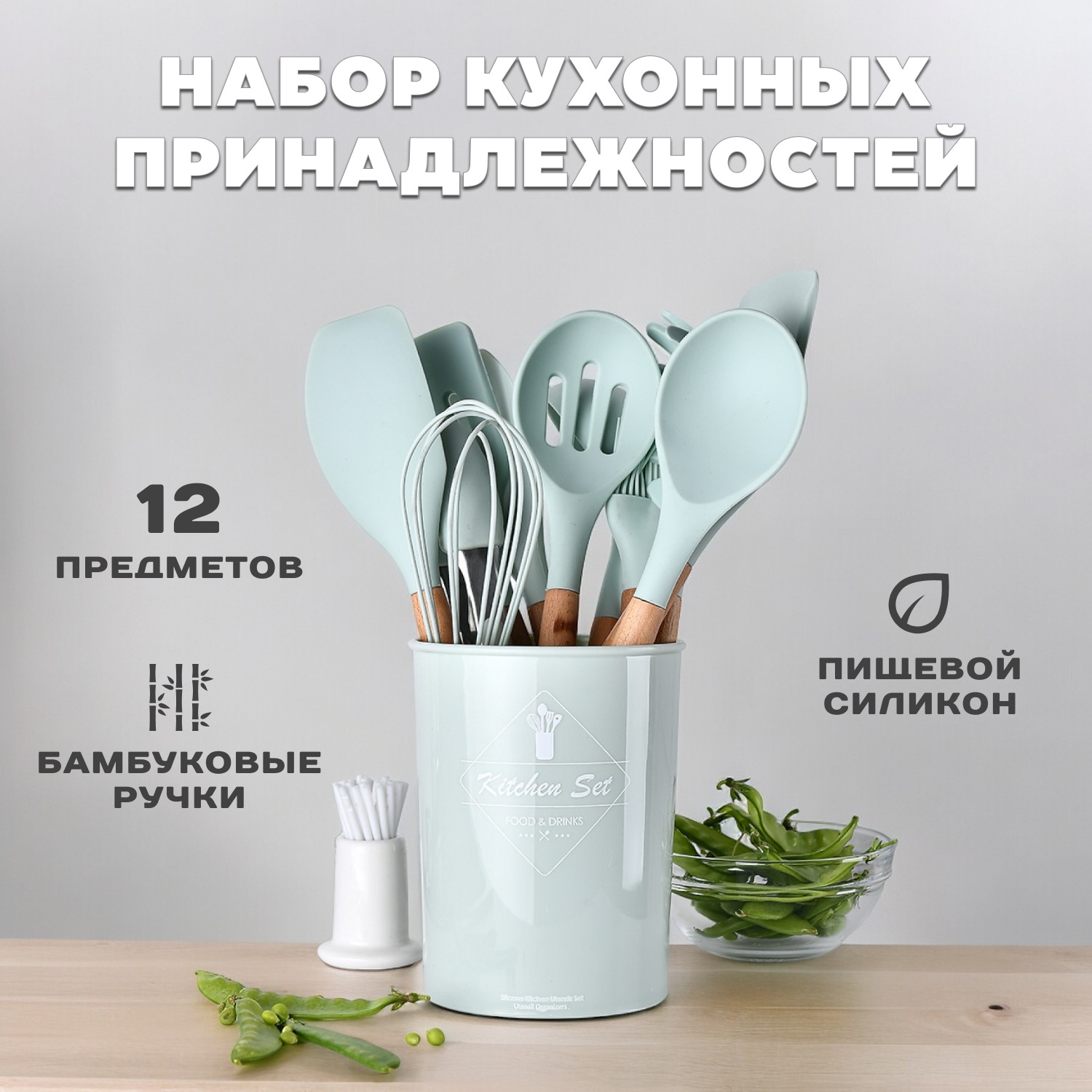 Красивый и функциональный набор кухонных принадлежностей на подставке, который будет отлично смотреться на вашей кухне, необходимый аксессуар для кухни дома, дачи и незаменимый помощник в готовке как на плите, так и в духовке. Комплект посуды выдерживает высокие температуры до 230 градусов. Набор лопаток не царапает поверхности, можно не боятся использовать для тефлоновой и керамической посуды. Комплект кухонных принадлежностей впишется в любое кухонное пространство. В наборе кухонного инвентаря 11 предметов и подставка. В набор входит 12 предметов из бамбука и силикона + подставка из пластика. Удобная лопатка для жарки, шпатель, венчик, щипцы, плоская ложка для выпечки, лопатка с отверстиями для слива масла, половник, ложка для салата, кисточка для масла, ложка для спагетти и шумовка. При приготовлении блюд кухонная утварь не впитывает посторонние запахи, а так же легко моется. Перед первым использованием набор необходимо хорошо промыть горячей водой с моющим средством.