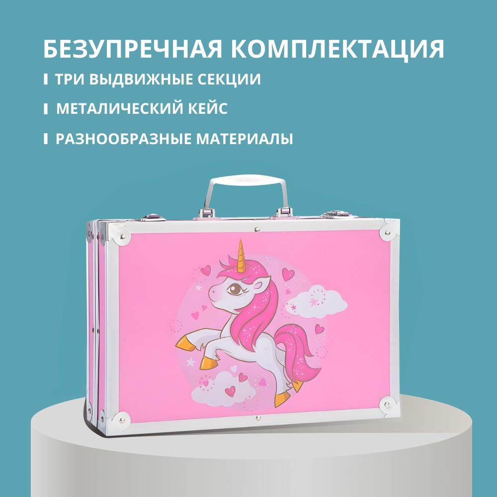 Набор для детского творчества «Единорог» включает 145 предметов в удобном алюминиевом кейсе. В комплект входят фломастеры, карандаши, масляные и акварельные краски, пастель, а также аксессуары. Кейсы защищены от повреждений и имеют надежные замки, что позволяет удобно хранить и переносить набор. Идеален для детей всех уровней, он стимулирует творчество и художественные способности.