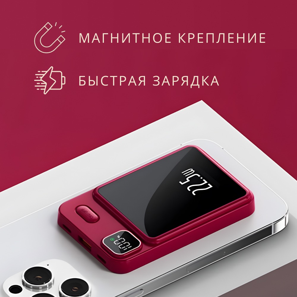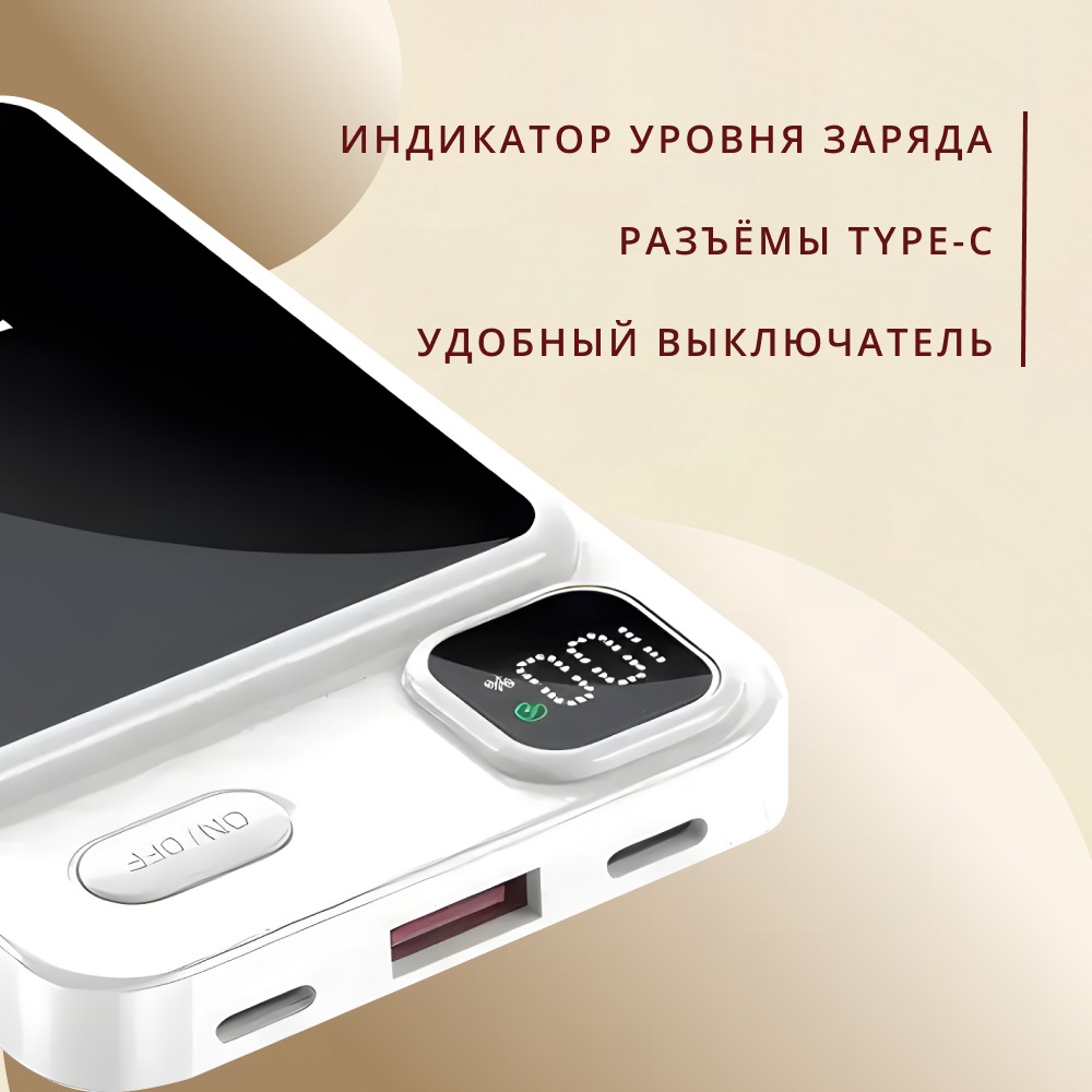 MagSafe Power Bank - это внешний аккумулятор емкостью 10 000 mAh, разработанный специально для устройств с поддержкой MagSafe. Благодаря компактному размеру и легкому весу, этот портативный аккумулятор удобно носить с собой, чтобы всегда иметь под рукой резервный источник питания.