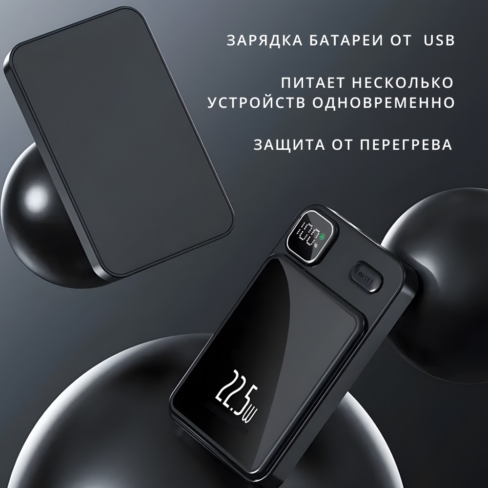 Портативный Power Bank MagSafe на 10 000 mAh — магнитный аккумулятор для устройств с поддержкой MagSafe. Компактный и легкий, он обеспечивает беспроводную зарядку и зарядку через USB Type-C. Магниты MagSafe позволяют легко прикрепить его к телефону и пр.