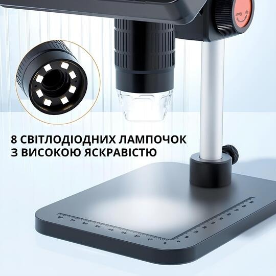 - 8 світлодіодів: 8 регульованих світлодіодів дозволяють використовувати мікроскоп в умовах низького освітлення або навіть у повній темряві.