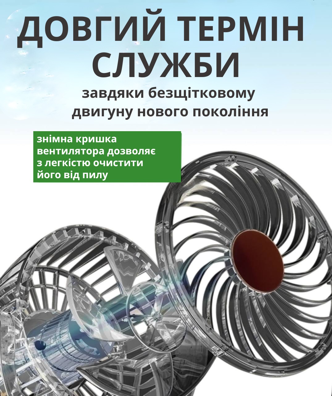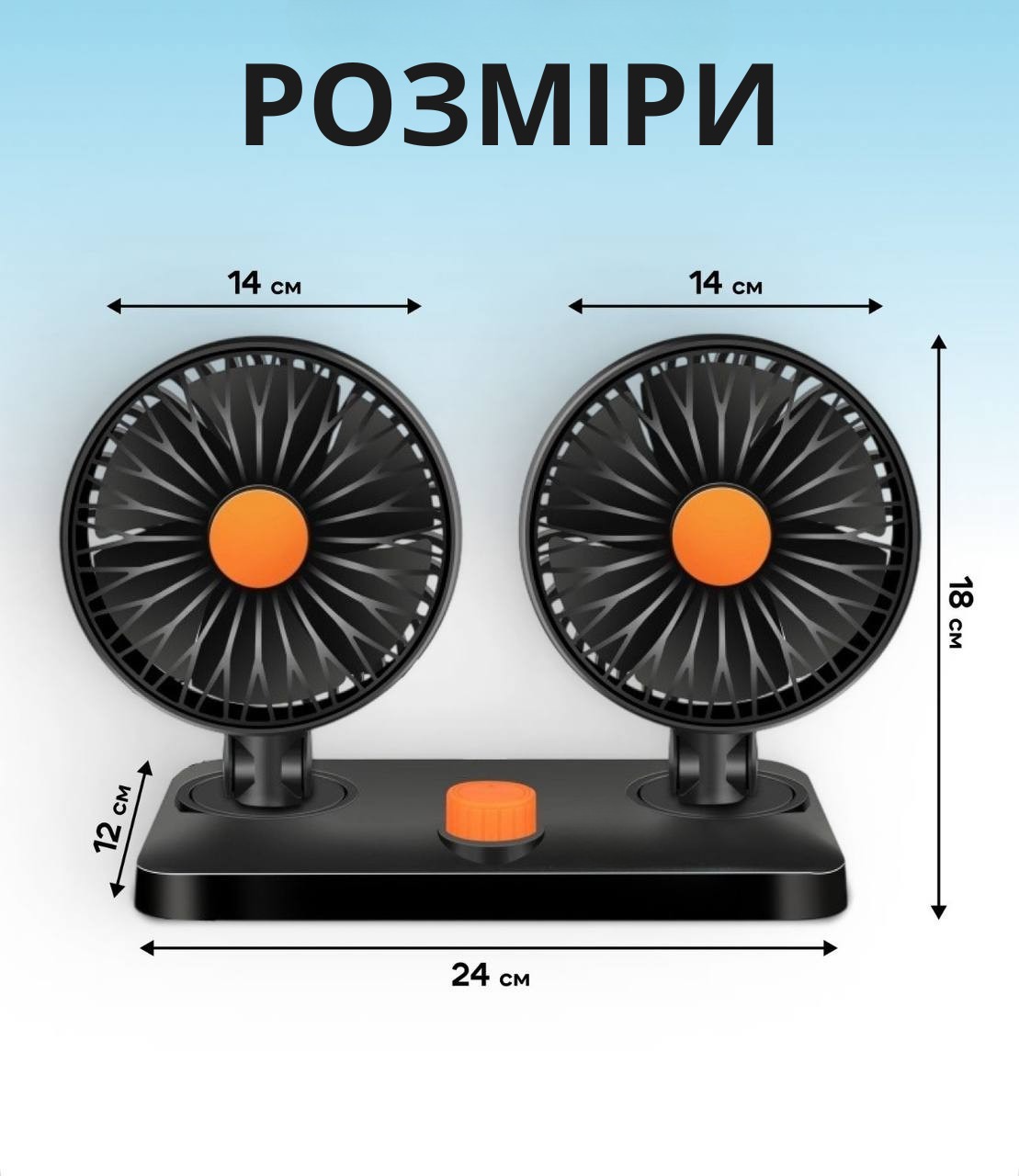 | Комплектація | Автомобільний вентилятор, кабель для підключення до прикурювача, двосторонній скотч для кріплення, упаковка |