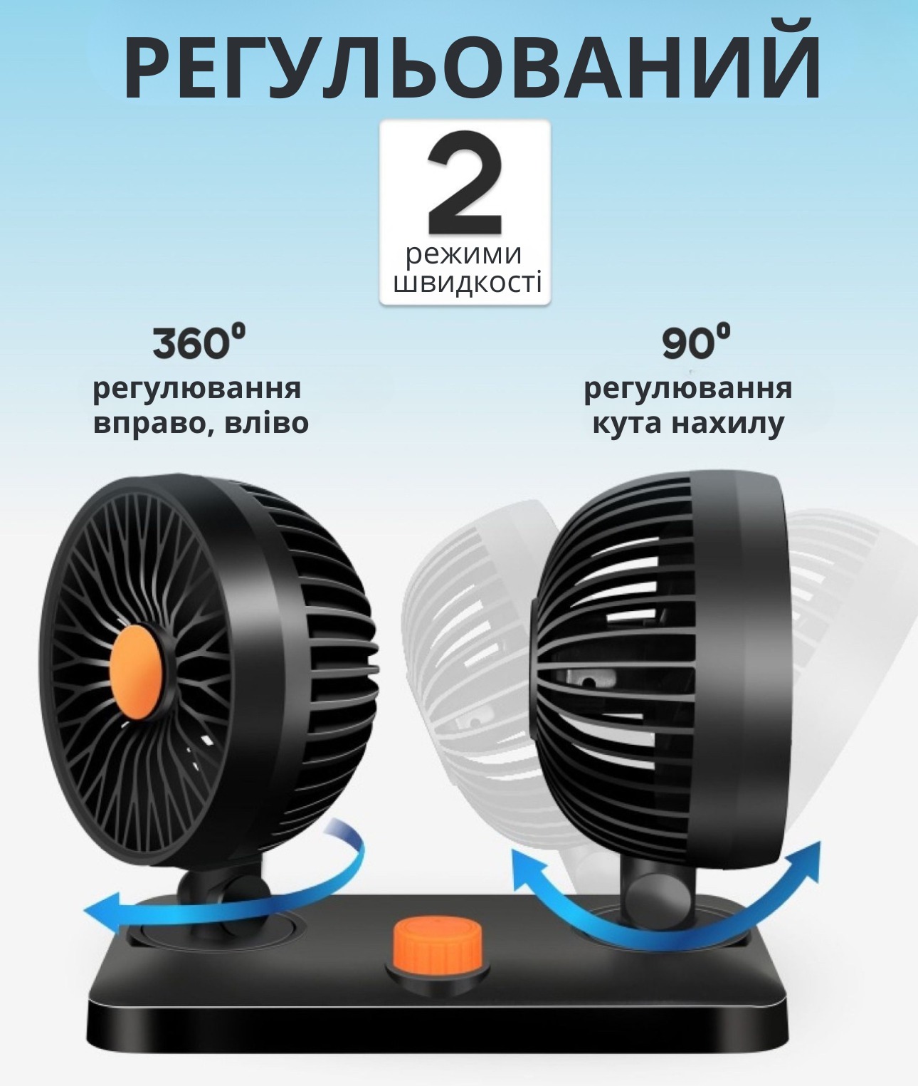 | Комплектація | Автомобільний вентилятор, кабель для підключення до прикурювача, двосторонній скотч для кріплення, упаковка |