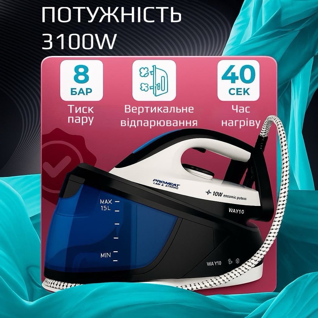 Потужний парогенератор WAYLO PRO-HEAT 3100W створений для швидкого та ефективного догляду за одягом і текстилем. Завдяки тиску пари до 8 бар і функції вертикального відпарювання, пристрій легко справляється навіть із щільними тканинами — льоном, бавовною, віскозою та вовною.
