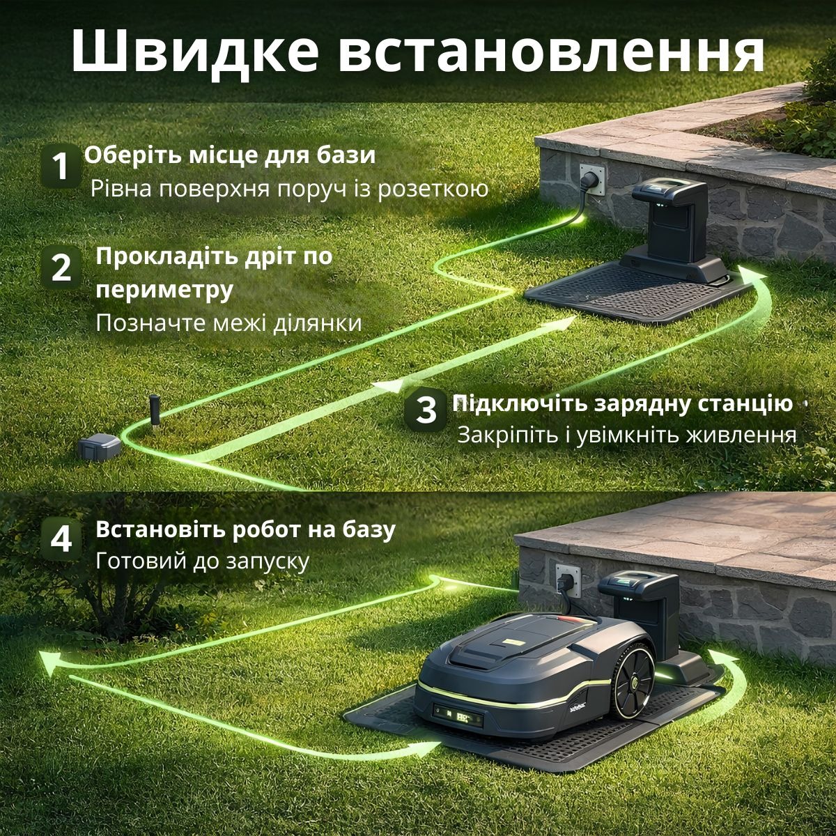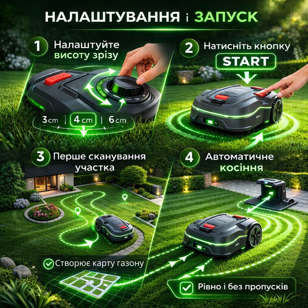 Після налаштування запустіть роботу. Косарка автоматично коситиме траву та повертатиметься на зарядку за потреби.