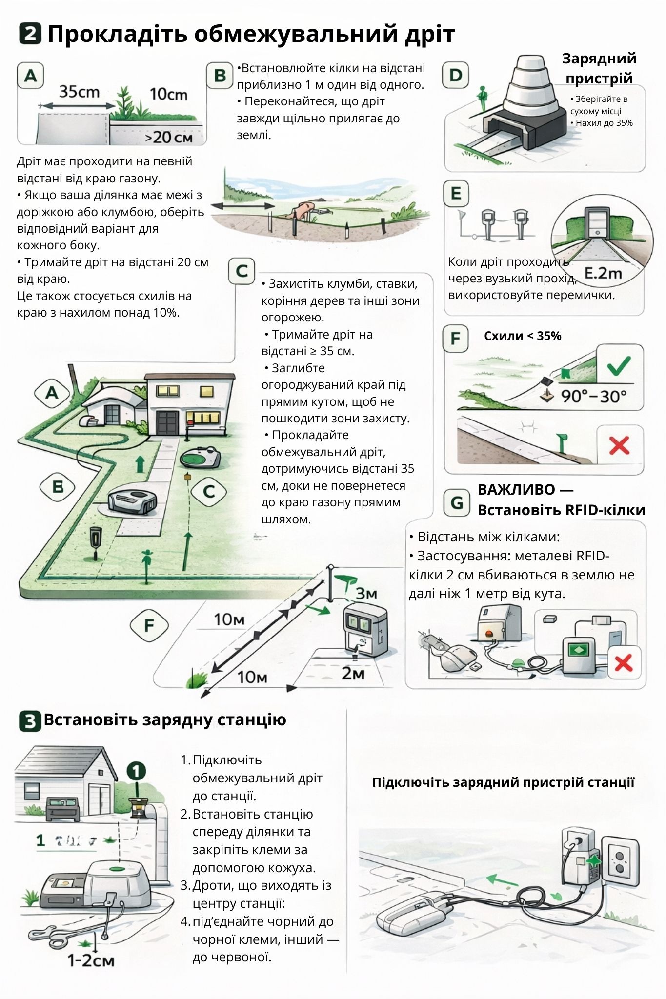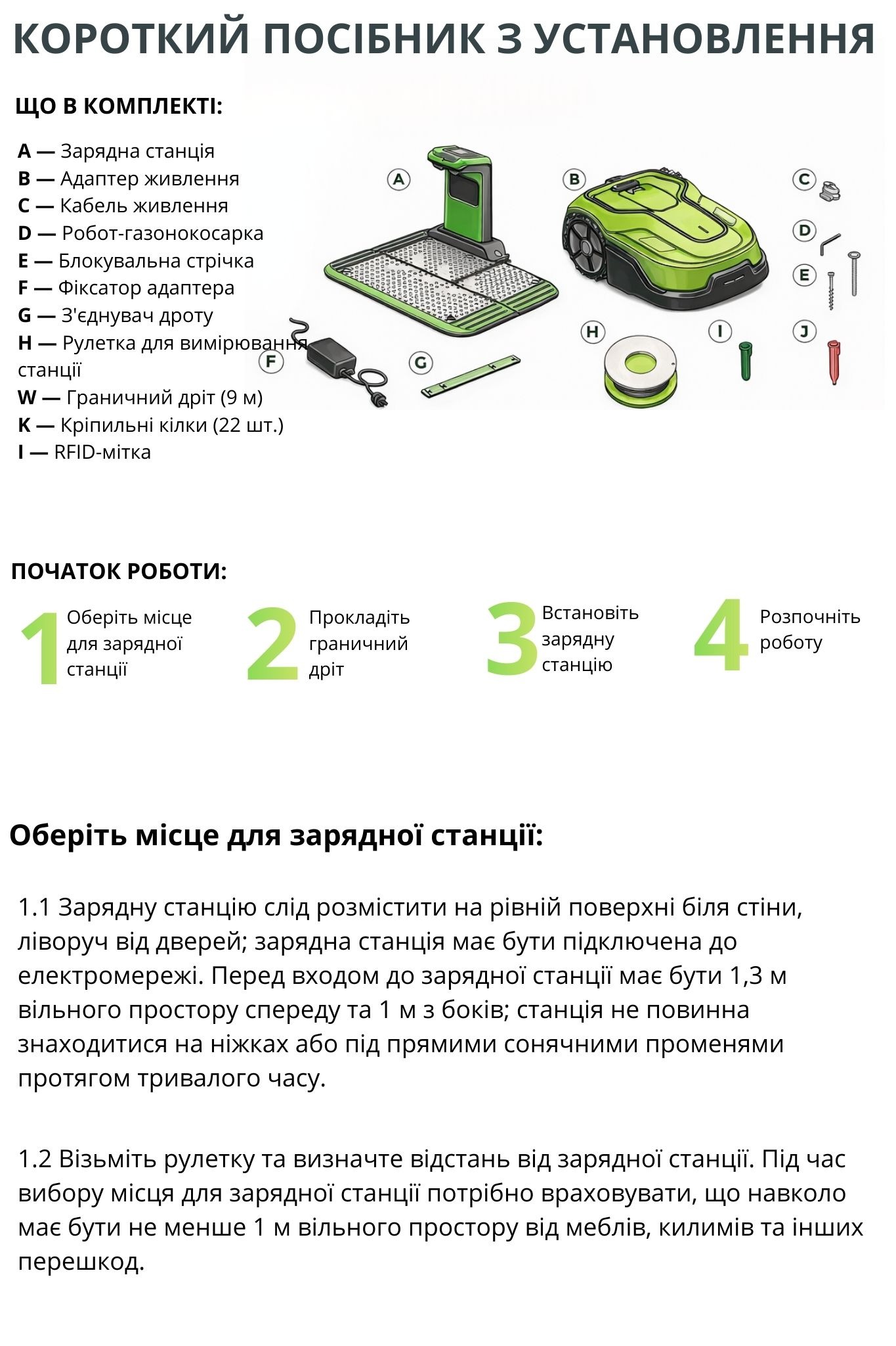 Встановіть зарядну станцію на рівній поверхні біля краю газону, поруч із розеткою. Залиште вільний простір навколо станції.