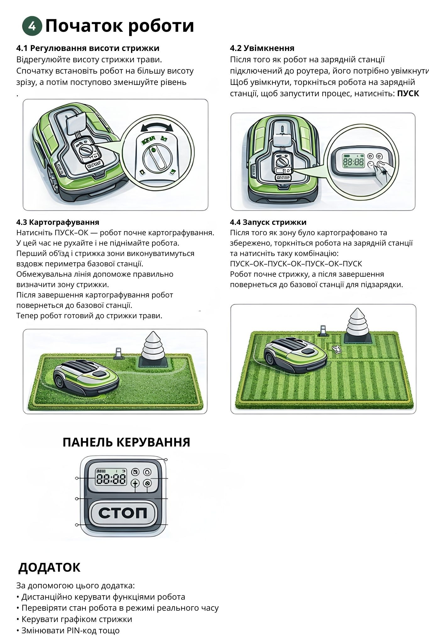 • Контроль зон косіння, стану акумулятора та прогресу роботи