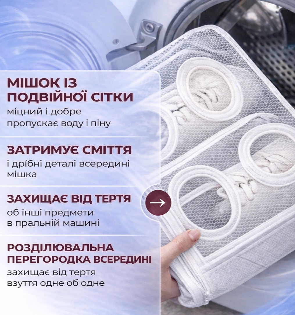 - Особливості: захищає взуття та барабан пральної машини під час прання