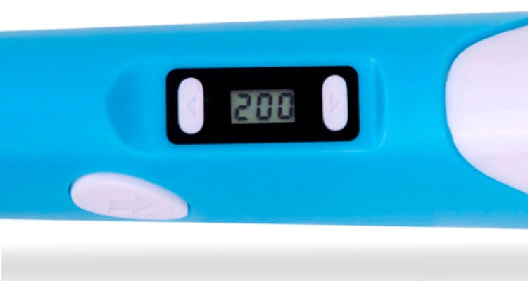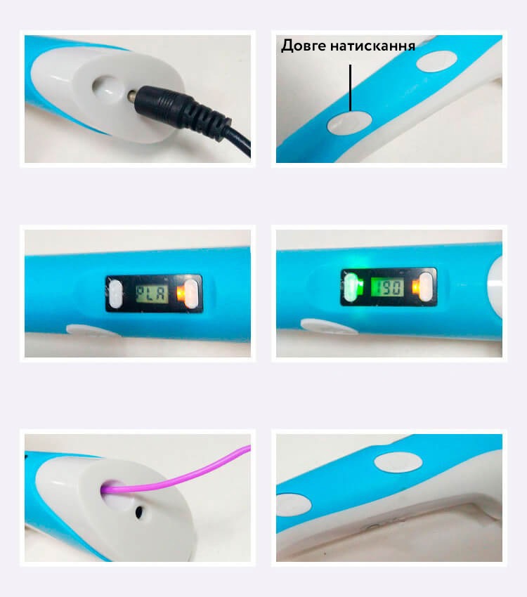 - При підключенні живлення важливо правильно вибрати режим, залежно від витратних матеріалів (PLA або ABS). Активація здійснюється одним натисканням відповідної кнопки. Червоний індикатор свідчить про розігрів пластикової нитки. Із цього моменту можна стежити за температурою. Готовність до роботи – зелений індикатор. Достатньо 1 раз вставити розхідник у спеціальний приймач, як далі він подаватиметься автоматично. Готова маса виходить із носика діаметром 0,7 мм.