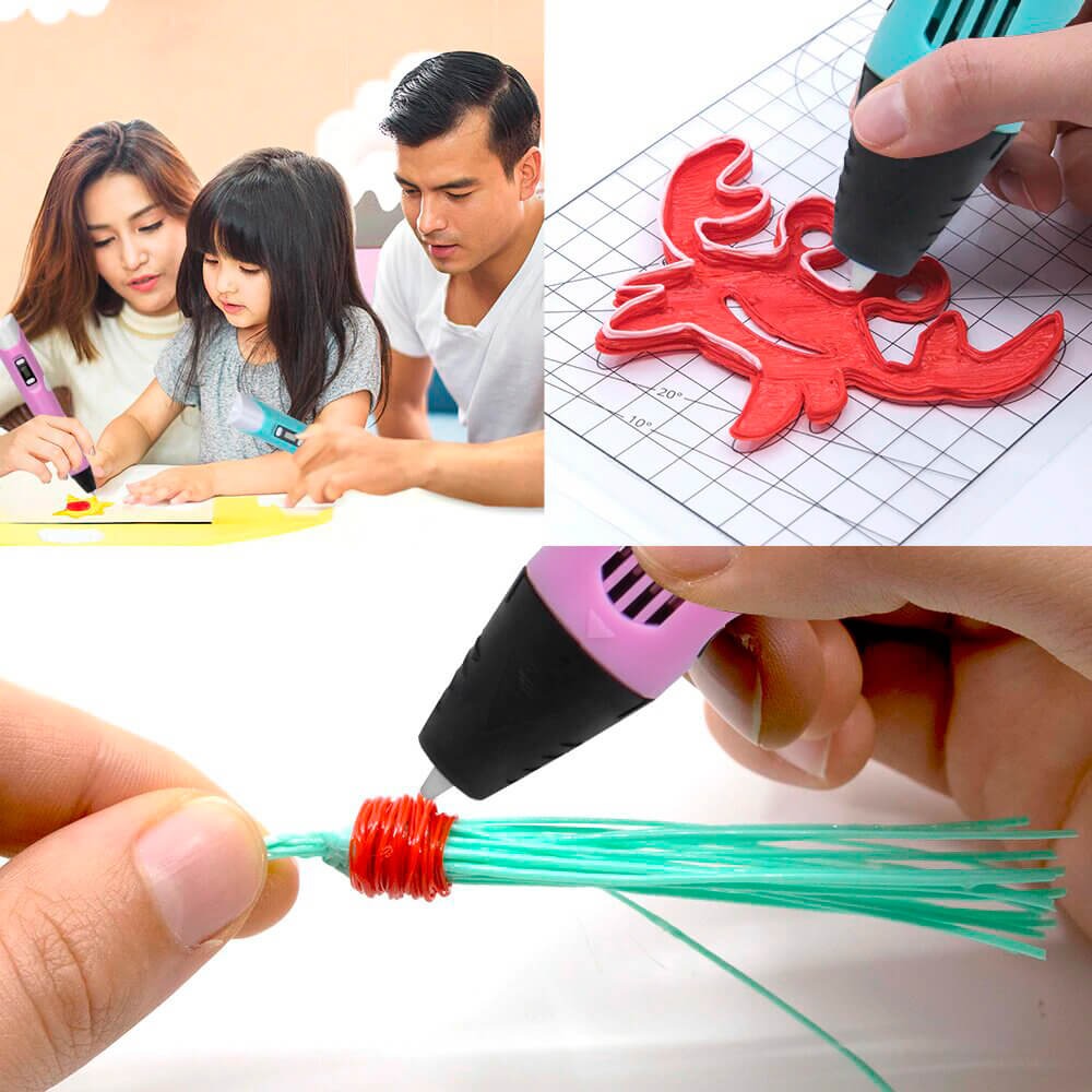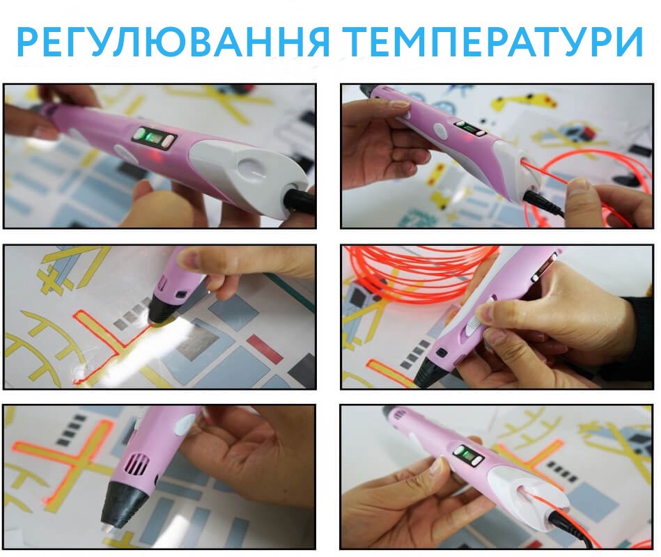 Як витратний матеріал для 3D ручки використовується спеціальний різнокольоровий пластик, який, нагріваючись, видавлюється назовні і відразу застигає, що дозволяє створити цільну і акуратну об'ємну конструкцію. Використовуючи 3D ручку, можна намалювати на папері або будь-якій плоскій поверхні окремі елементи після з'єднання їх у складну модель. Застиглий пластик легко зняти з робочої поверхні.Дана ручка має можливість малювати трьома типами пластику ABS, PLA.