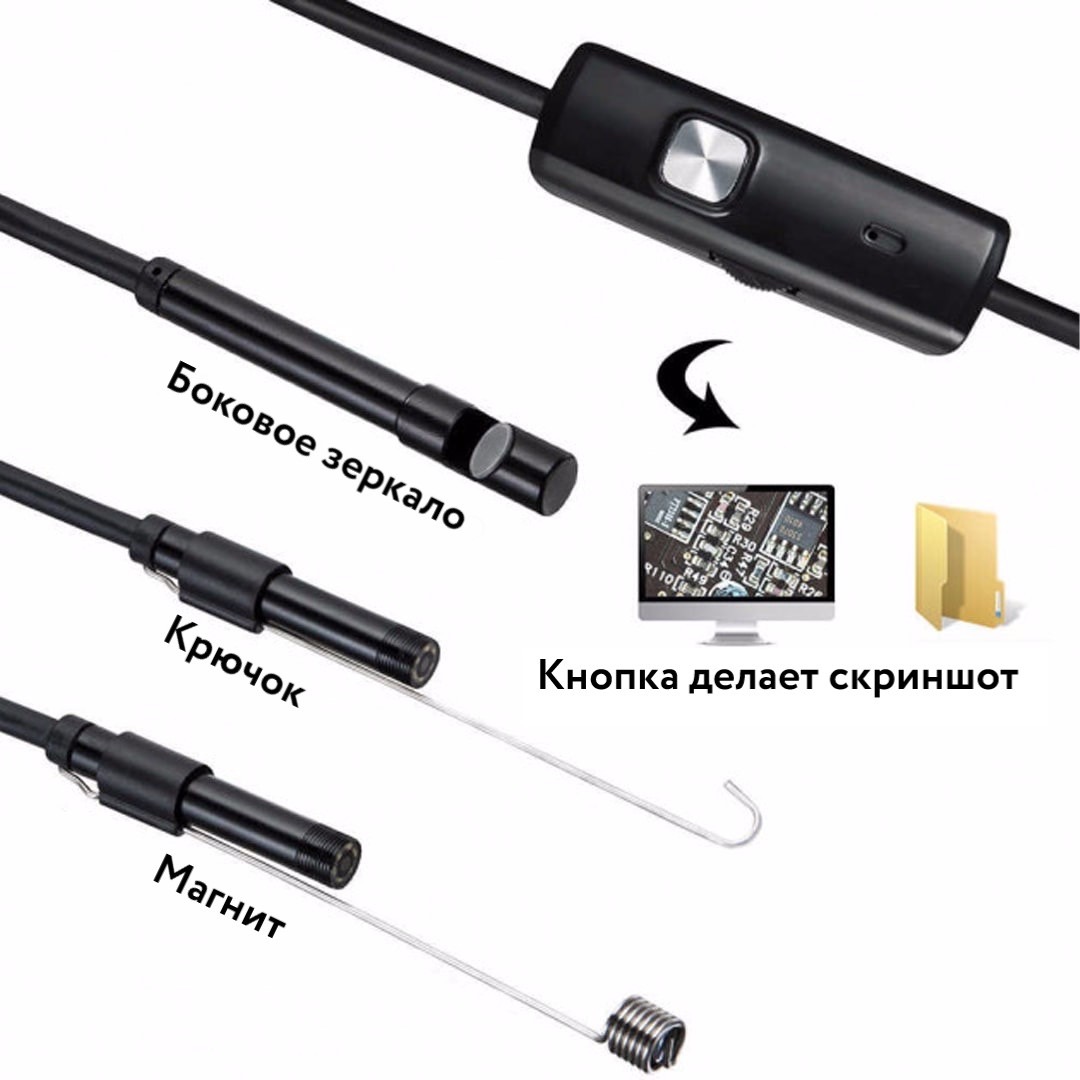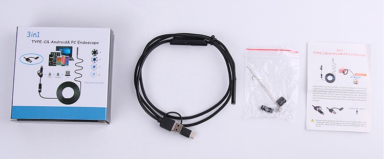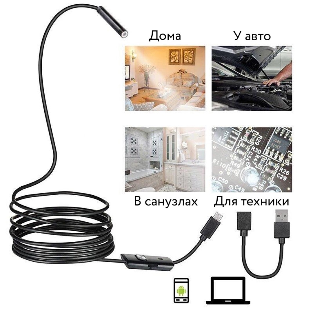 Твердий ендоскоп для технічного використання. Цей ендоскоп застосовується для перегляду важкодоступних місць, таких як двигун автомобіля, каналізаційні труби, димоходи, закриті ванною матеріалом і т.д. USB камера (ендоскоп) підключається до ПК, ноутбука, планшета або смартфона і передає кольорове відео та фото на його екран. На головці зонда розташований LED ліхтарик. Яскравість підсвічування коліщатком на пульті управління. Ендоскоп водонепроникний для занурення під воду на глибину до 10 метрів та до 90 хв.