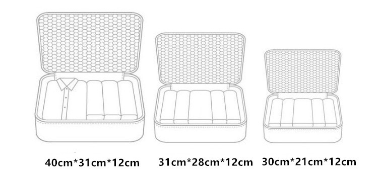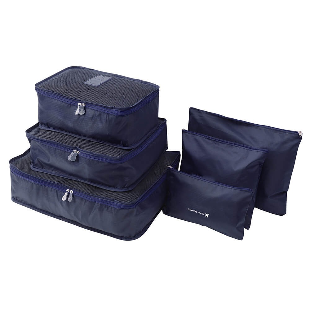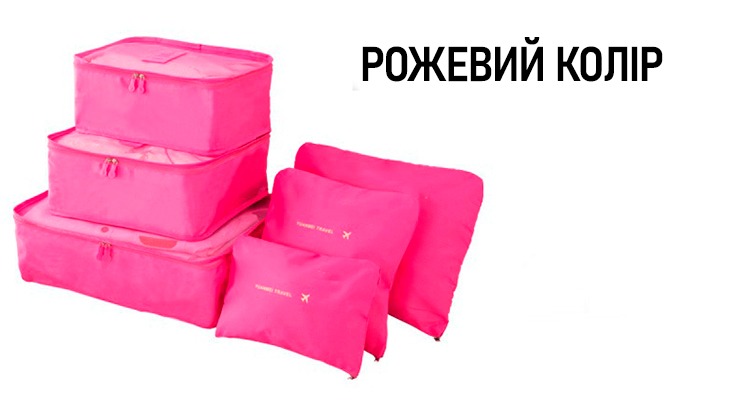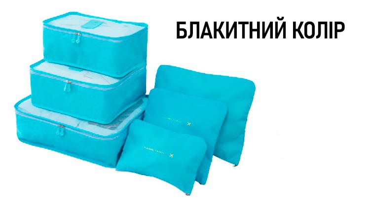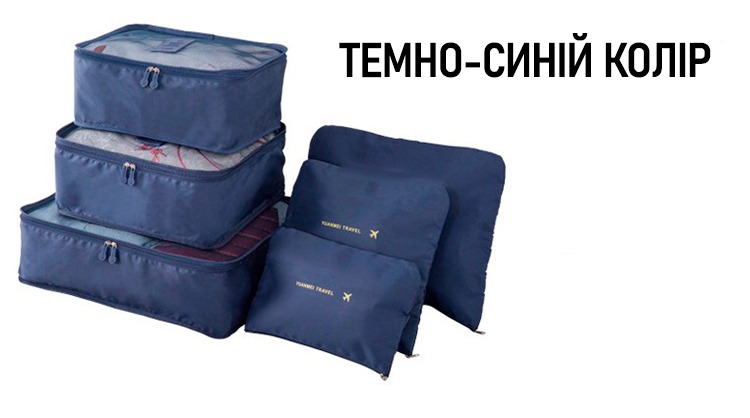 Набір складається з 6 органайзерів, у яких поміститься все необхідне вам у дорозі.Дорожні органайзери виготовлені з міцного поліестеру та м'якої нейлонової сітки. Сітка у верхній частині чохлів призначена для легкої ідентифікації вмісту та вентиляції. Вони легкі і вміщують велику кількість предметів. Великі чохли чудово підійдуть для білизни, одягу та взуття. А маленькі для предметів гігієни, ліків, косметики чи документів.