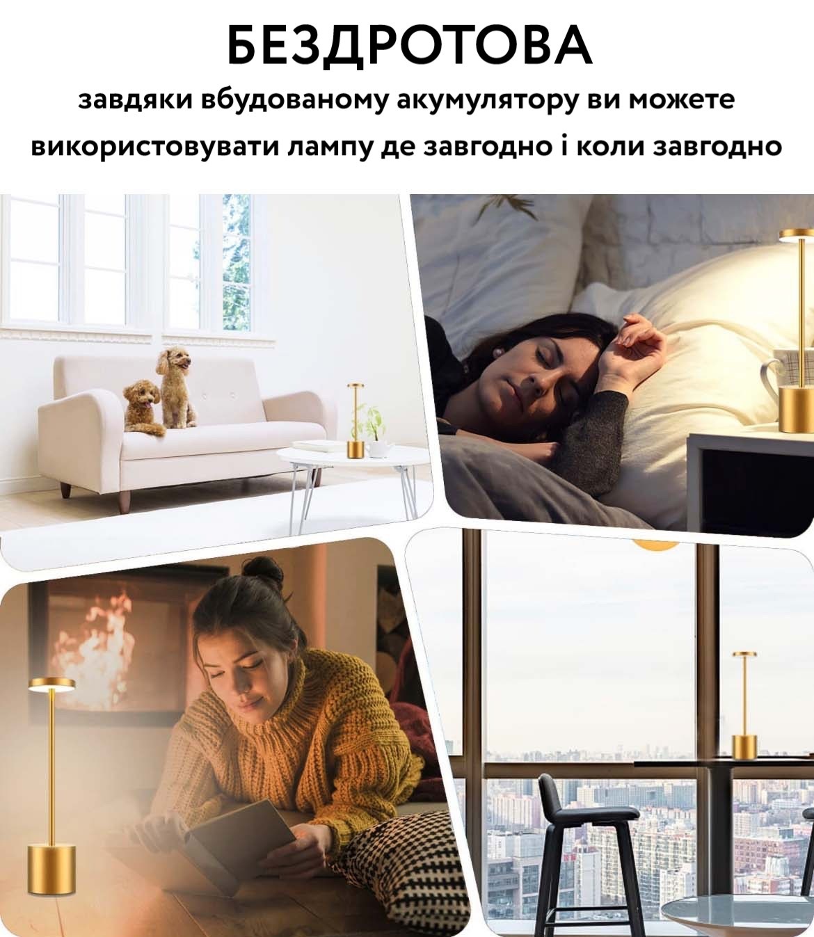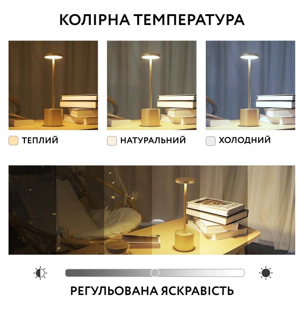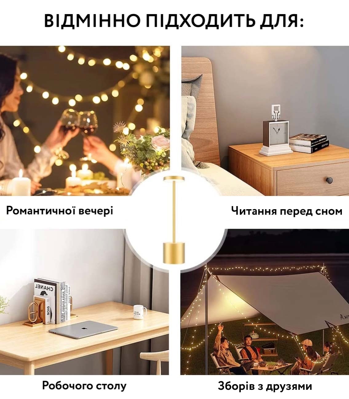 Мінімалістична настільна лампа ефектно підсвітить ваш простір. Завдяки вбудованому акумулятору, ви можете розмістити лампу в будь-якому місці: у спальні, кабінеті, офісі, вітальні, їдальні, кафе, готельних номерах і т.д.
