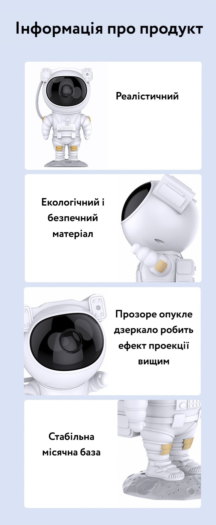 Нічник Астронавт - це проектор зоряного неба, з 8 вбудованими варіантами кольорів космічних Галактик.