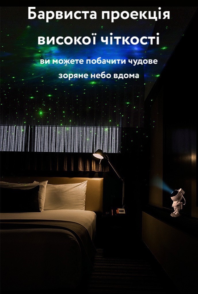 З LED-світильником Космонавт щовечора можна спостерігати за яскравими різнокольоровими картинками різних галактик прямо зі свого ліжка.