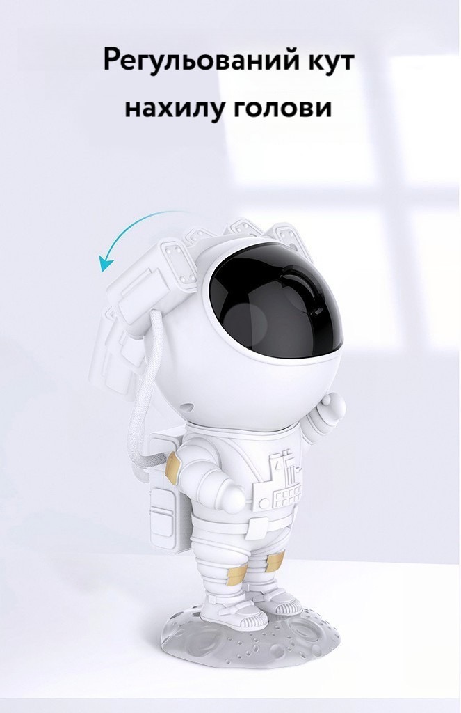 Проектор-світильник Космонавт має рухливі руки (можуть обертатися навколо своєї осі). Також змінюється положення голови завдяки кріпленню до тіла магнітною абсорбцією (можна повернути в різні боки під кутом до 90 градусів). На шоломі фігурки розміщена камера самого проектора, тобто, повертаючи голову астронавта, ви можете змінювати положення зображення-проекції.
