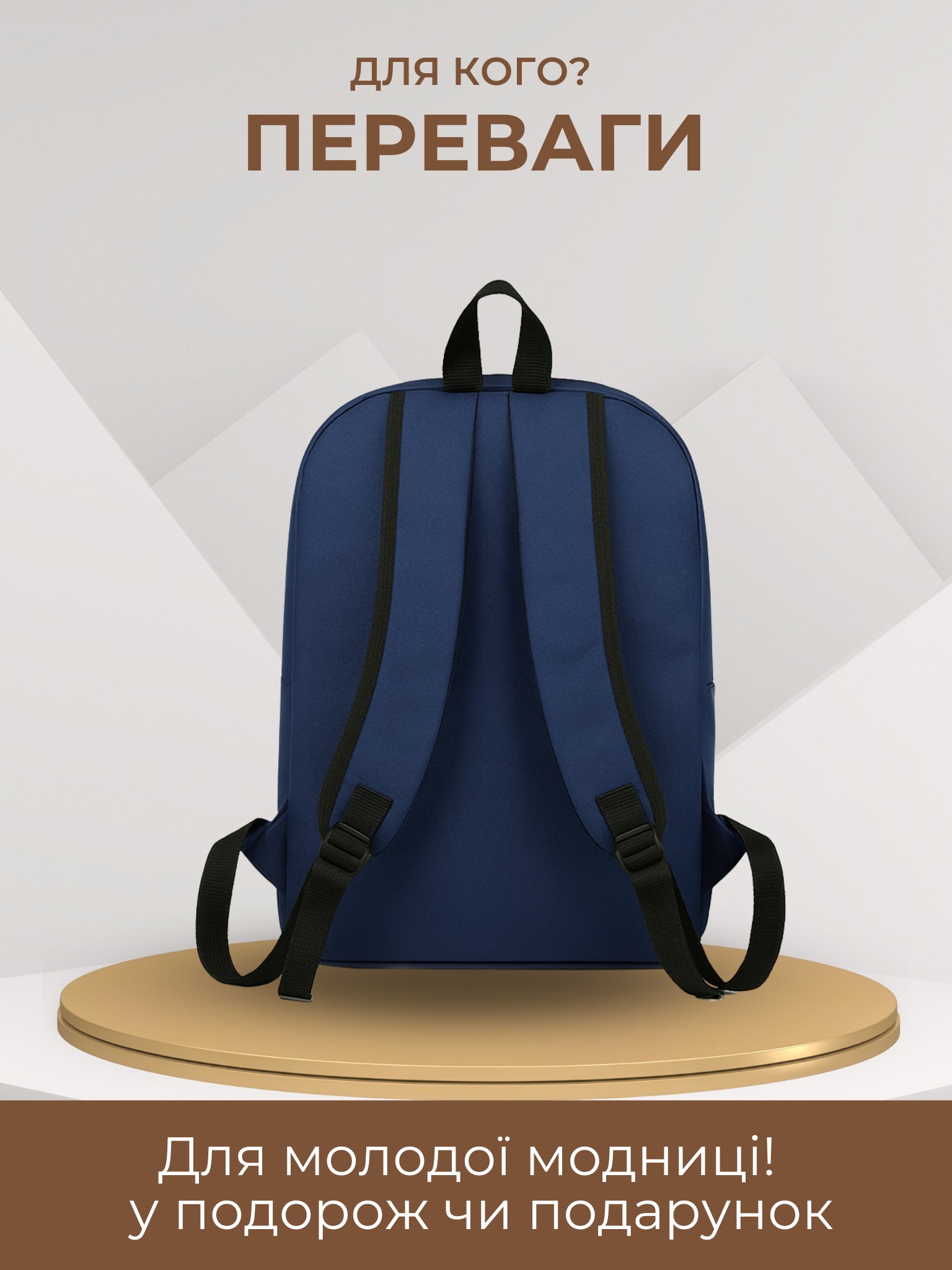 | Функції | Якість пошиття і матеріалу, місткість, яскравий дизайн, водозахисний матеріал, металеві замки, регульовані лямки, одне відділення, передня кишеня на блискавці, бічні кишені, внутрішня підкладка і кишеня під великий гаджет |