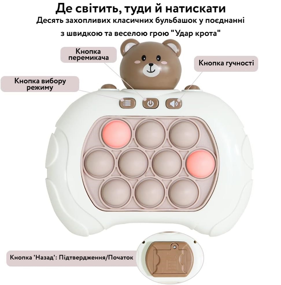 Електронний POP-IT – це захоплююча та яскрава гра на швидкість та уважність, яка подарує безліч радісних моментів як дітям, так і дорослим. Ігрова платформа оснащена захоплюючими звуковими та світловими ефектами, що робить процес ще більш напруженим та цікавим. Виготовляється з якісних матеріалів: міцного пластику та м'якого силікону, що забезпечує довговічність та безпеку під час гри. Працює від батарейок, що дозволяє використовувати його у будь-якому місці. Стати майстром реакції та насолоджуйтесь веселим проведенням часу з друзями та сім'єю!
