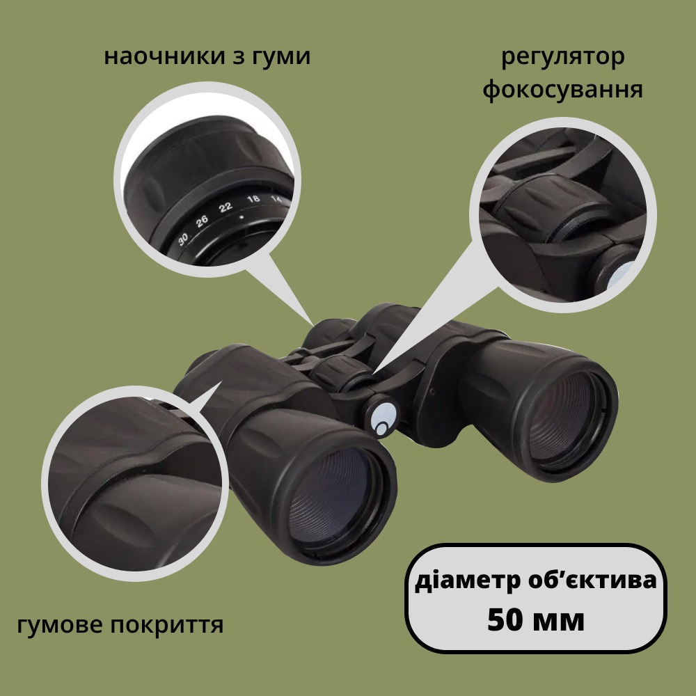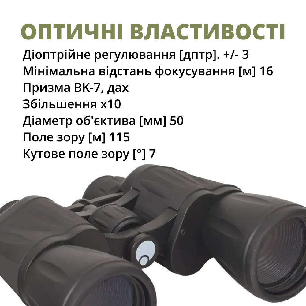 Призма Порро. Збільшення: 10x. Діаметр об'єктива: 50 мм