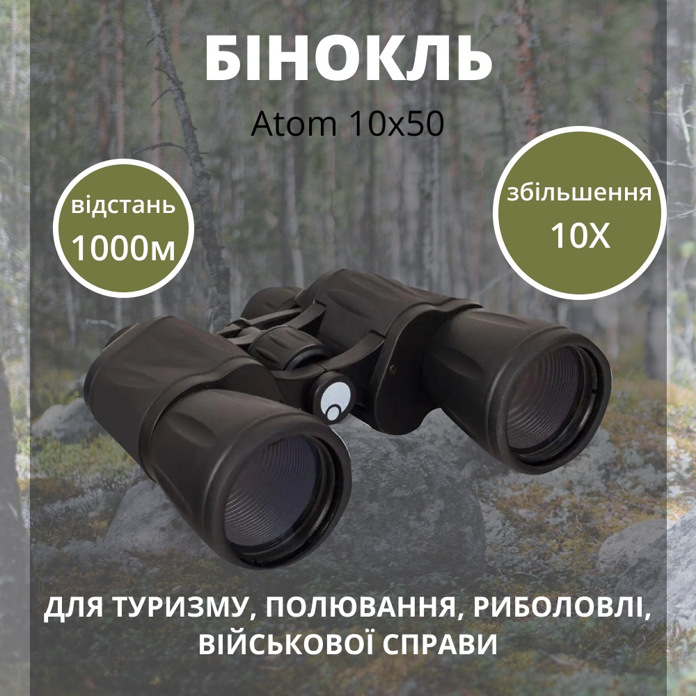 Бінокль Atom 10x50 з призмою Порро та збільшенням 10x ідеально підходить для спостережень у будь-яких умовах. 50-мм об'єктиви забезпечують яскраві та чіткі зображення. Корпус з гумовим покриттям гарантує надійний хват та захист від ударів, пилу і вологи. Лінзи мають повне просвітлення, а м'які наглазники підвищують комфорт. Є можливість кріплення на штатив.