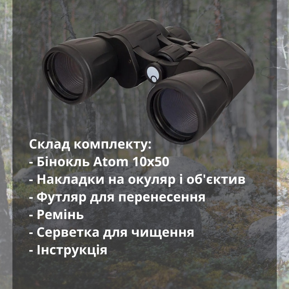 Призми Porro, які використовуються в біноклі Atom 10x50, виготовлені зі скла BK-7, а лінзи мають повне просвітлення для поліпшення здатності збирати світло. Для подальшого підвищення комфорту користувача бінокль оснащений м'якими гумовими наочниками.