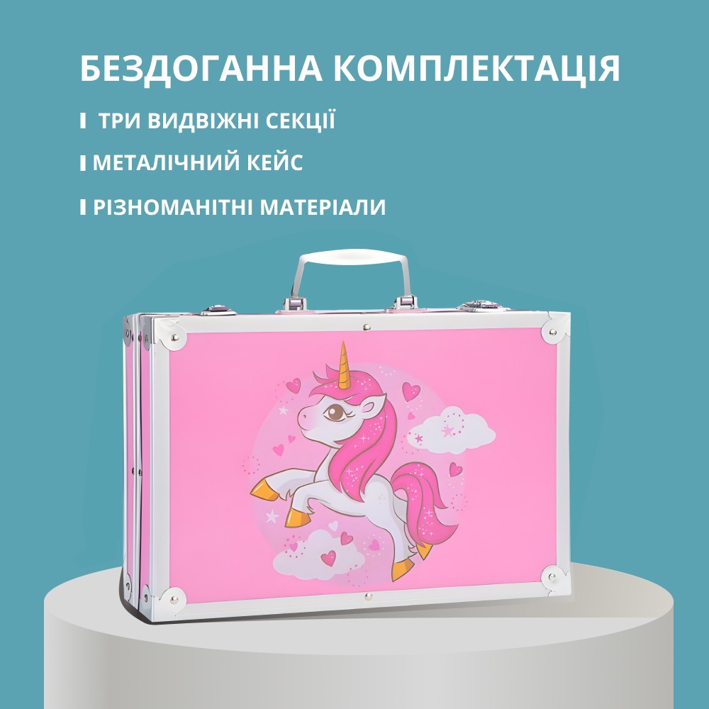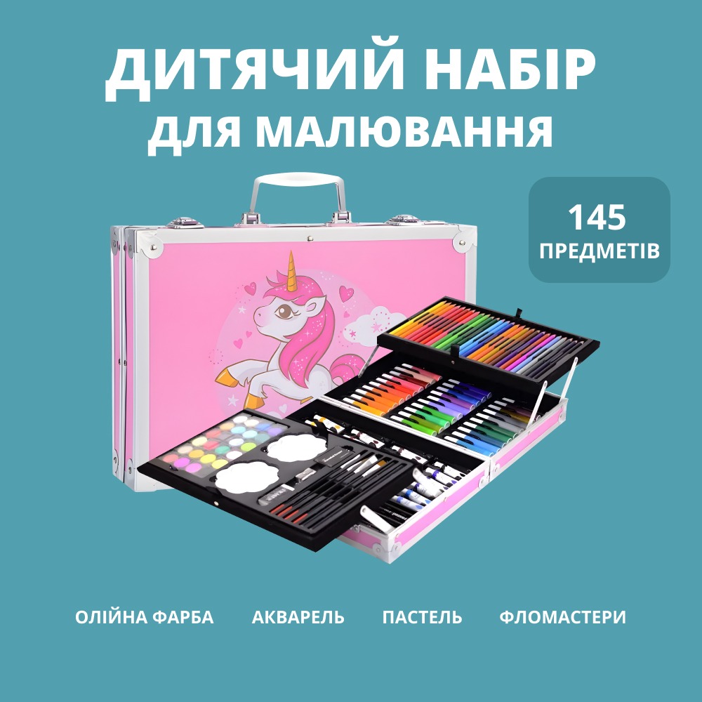 Набір-валіза для дитячої творчості на 145 предметів в алюмінієвому кейсі "Єдиноріг" - це справжня майстерня юного художника! У художньому наборі ви знайдете все необхідне для створення малюнків та художніх картин: широку палітру фломастерів і олівців, масляних фарб і пастелі, акварельних фарб, а також безліч аксесуарів та корисних дрібниць.