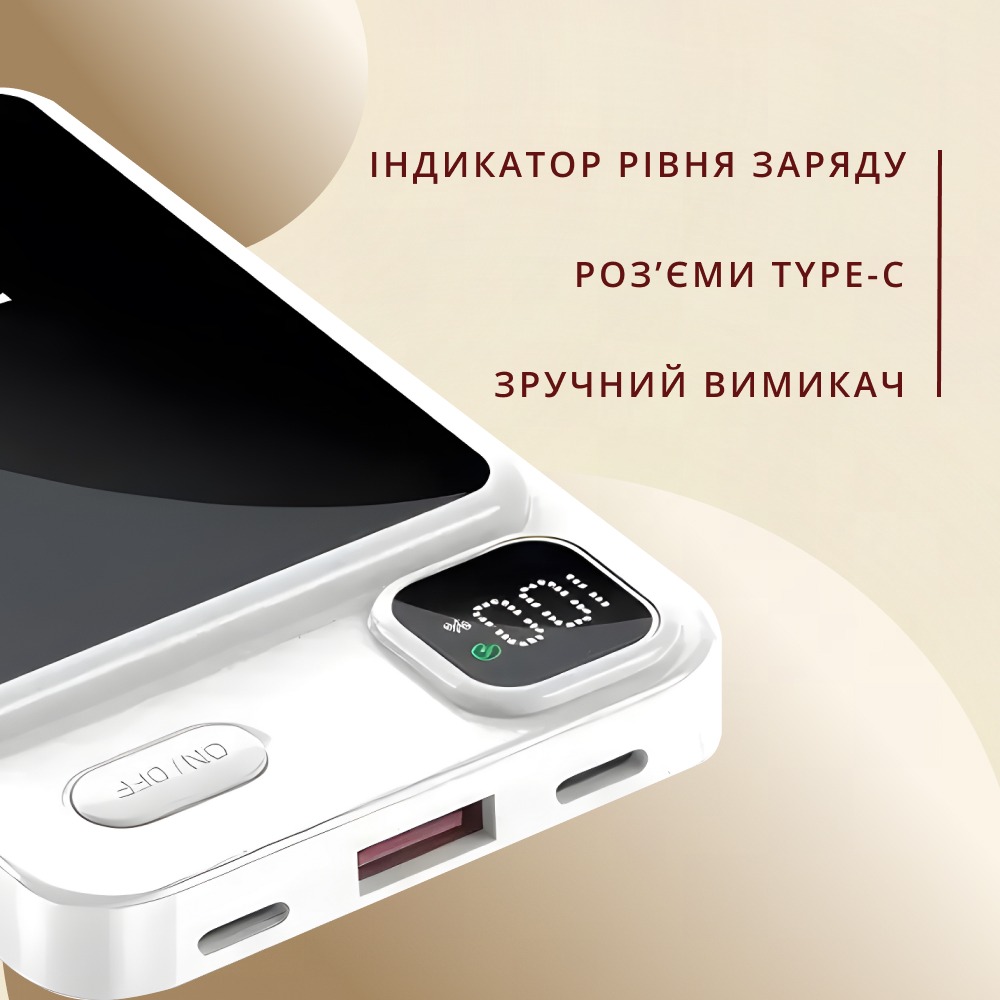 MagSafe Power Bank — це зовнішній акумулятор ємністю 10 000 mAh, розроблений спеціально для пристроїв із підтримкою MagSafe. Завдяки компактному розміру та легкій вазі, цей портативний акумулятор зручно носити із собою, щоб завжди мати під рукою резервне джерело живлення.