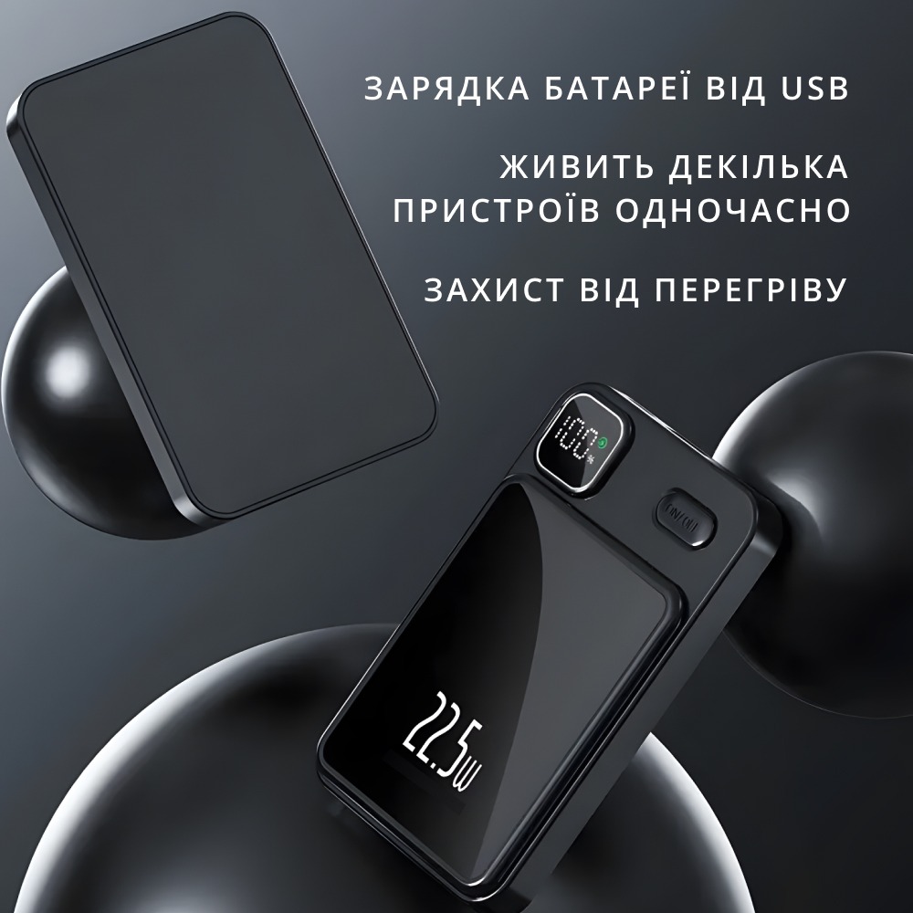 Він підтримує не тільки бездротове заряджання, а й заряджання через роз'єм Usb Type-C, що дає змогу використовувати його для підзаряджання різних пристроїв. Магніти MagSafe дають змогу легко приєднати акумулятор до вашого iPhone, перетворюючи їх на єдине ціле.