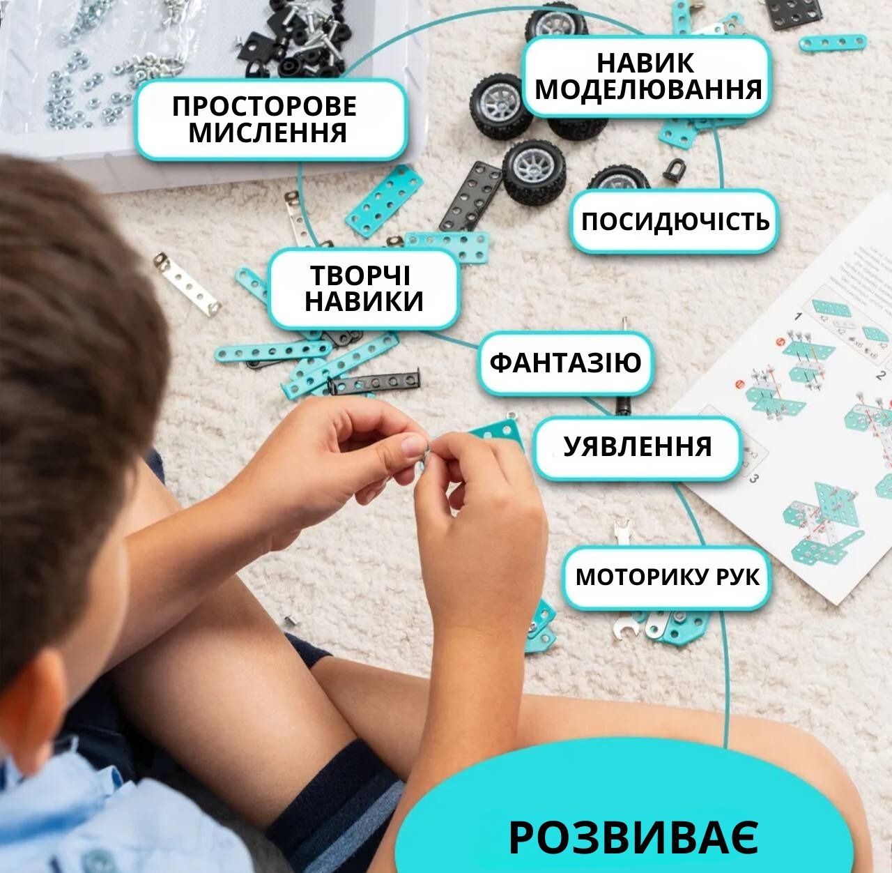 Металевий конструктор — чудовий спосіб розвивати творчість та навички у дітей. Набір містить металеві деталі різних форм, які легко з'єднуються. Складання сприяє розвитку дрібної моторики, креативності та логічного мислення, а також навчає працювати в команді та долати труднощі при створенні моделей.