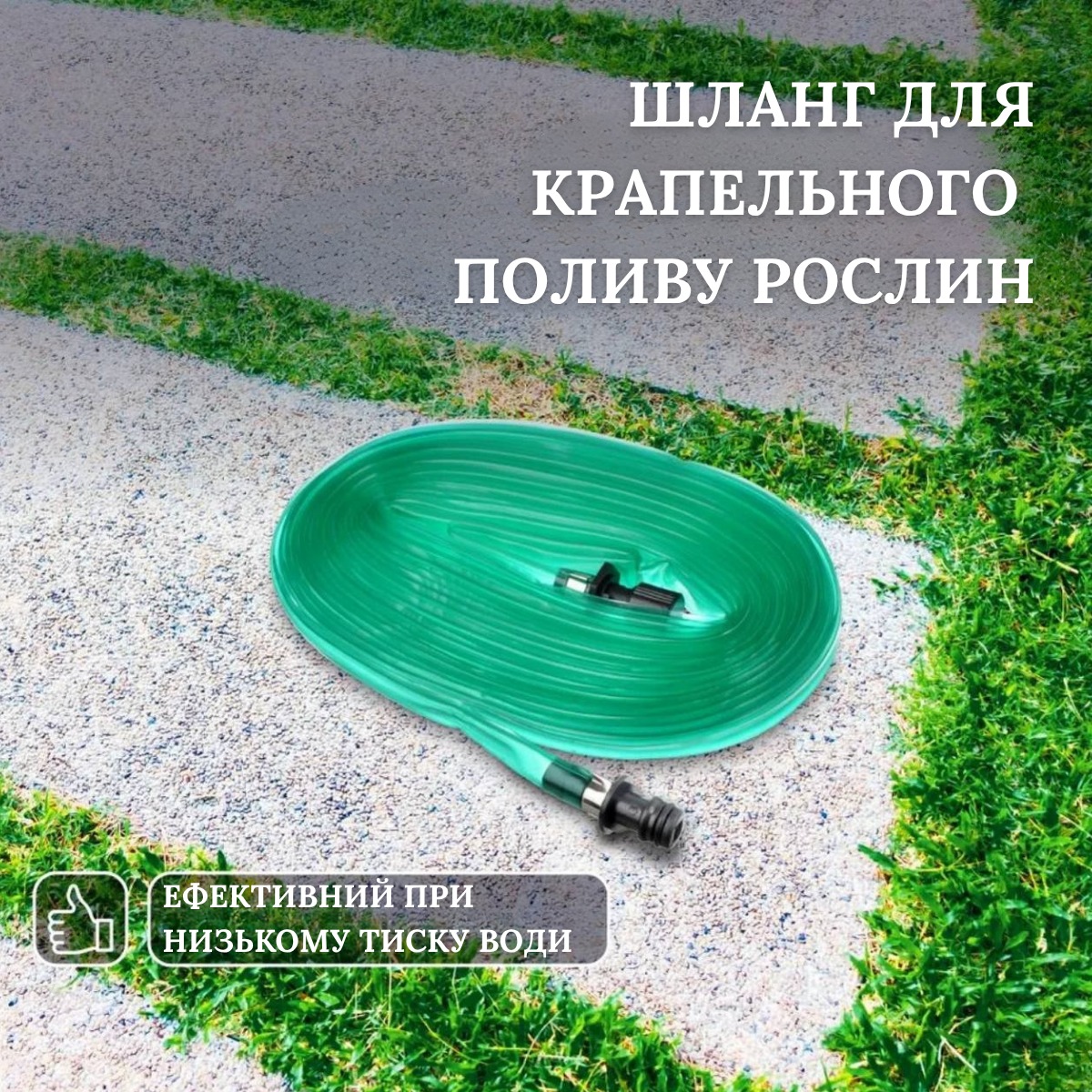 Зелений садовий шланг довжиною 10 м, обладнаний системою крапельного зрошення, що дозволяє зручно та рівномірно поливати садові рослини, газони та квітники. Легкий у використанні, з міцною якістю матеріалу, він ідеально підходить для автоматичного та ручного зрошення.
